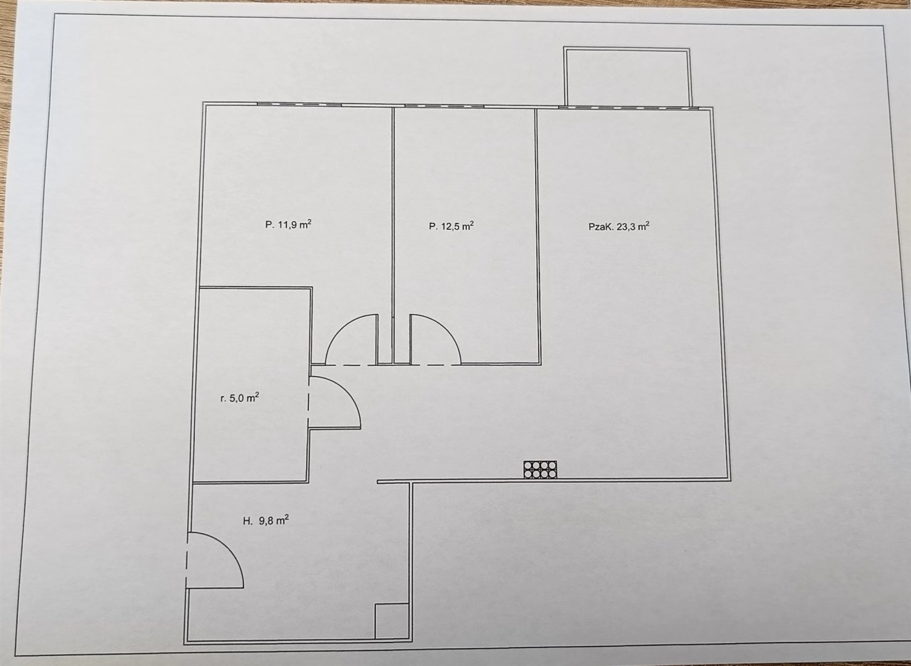 Rozkład: przedpokój ( 9,8 m2), salon z aneksem kuchennym i balkonem ( 23,30 m2), dwie sypialnie ( 9,60 i 12,50 m2), łazienka ( 5 m2).